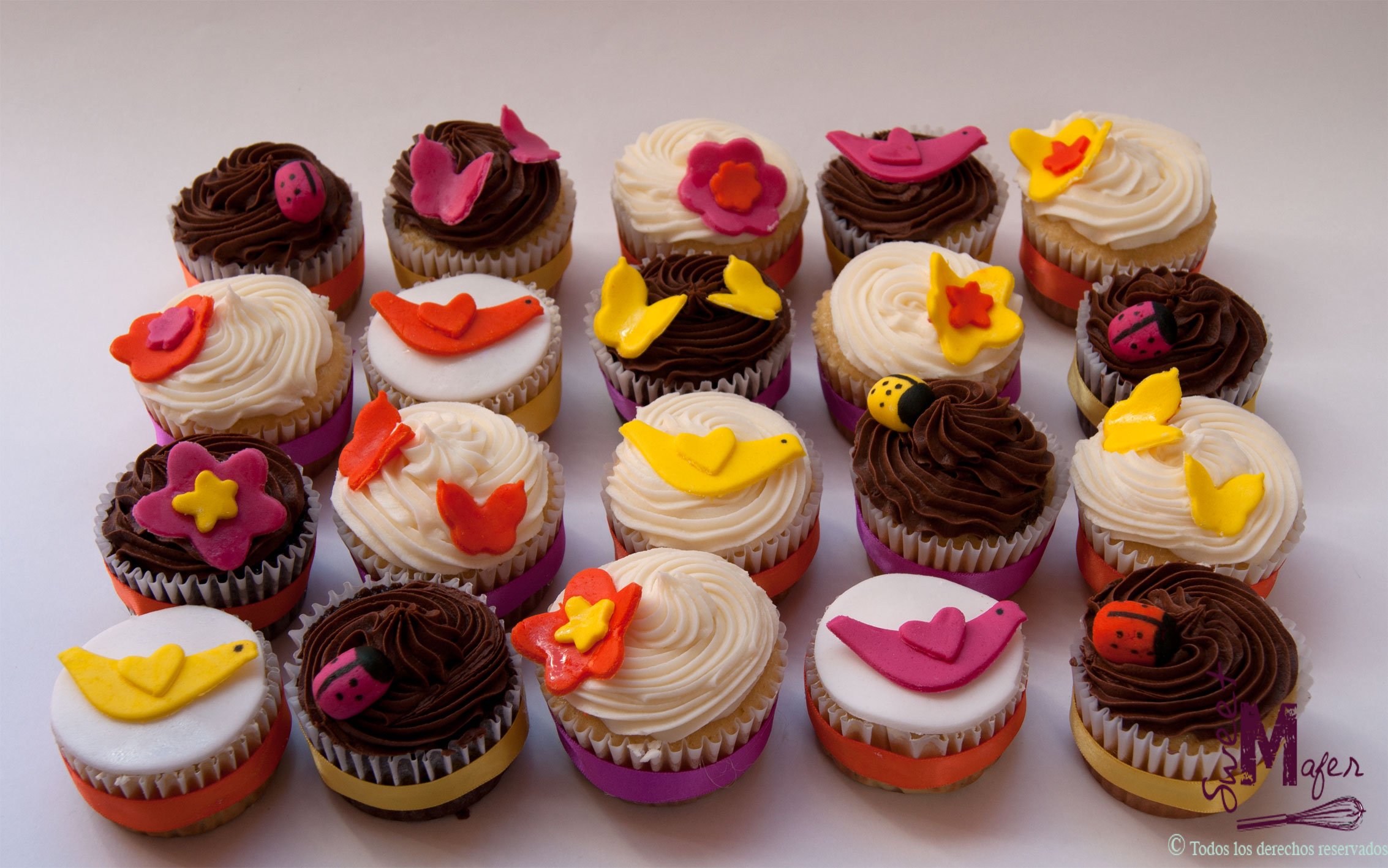 Ayer entregué los cupcakes para la boda de Tatiana y Sergio, tema jardín, con mariquitas, mariposas, flores y pájaros, en tonos fucsia, amarillo y naranja. Hoy entregué una de la casa de Mickey para el primer cumple de Manuela y una de Piratas del Caribe con cupcakes a juego para el cumple de Gregorio. Mañana también entrego otros para Milo con notas musicales, no alcancé a tomar fotos. También es mi cumple, pero claramente, no me hice mi torta y fui a buscar una pero no encontré nada que me gustara, así que la pastelera, no pudo soplar las velitas.