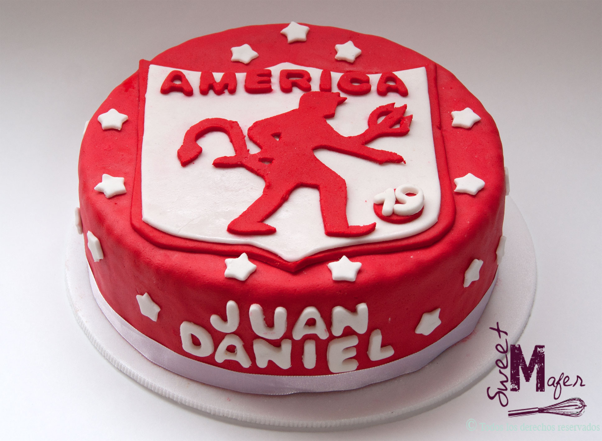 Para los 19 años de Juan Daniel, Gina y su socia, que organizaron la reunión, me mandaron a hacer esta torta marmolada de media libra con el escudo del América de Cali. Aunque me tío abuelo Pedro Sellarés fue uno de sus fundadores y mi primo Mauricio, «el pelao» Romero ha sido jugador del equipo, en mi casa fue todo un cuento porque mi esposo es del Cali.