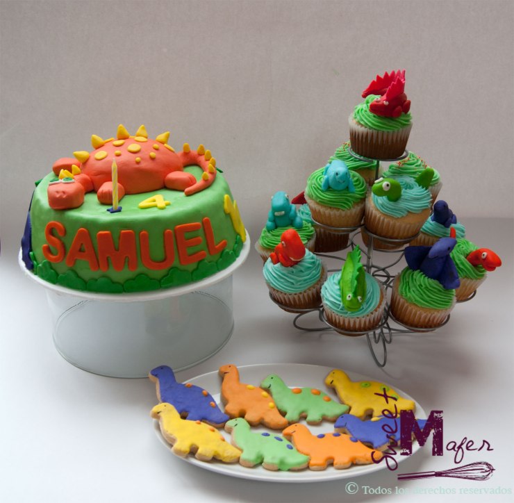 Este set de torta, cupcakes y galletas de dinosaurios son para Samuel, el galán o novio de mi hija Antonia quien mañana celebra sus 4 años.