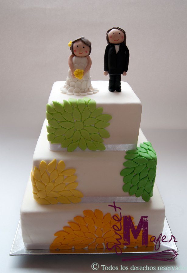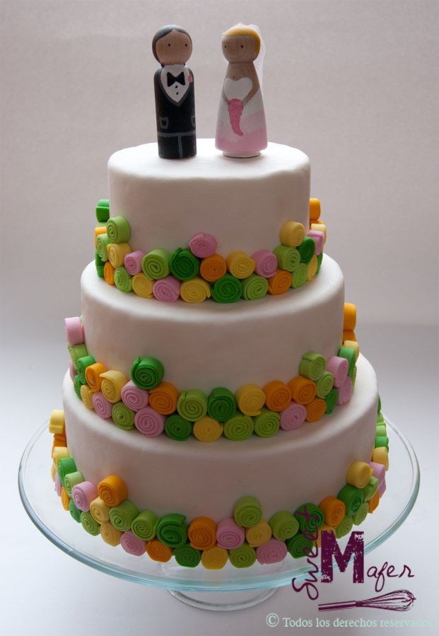 Torta mil rollitos con novios de madera de Cuento de Bodas.