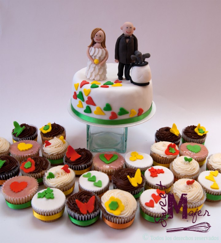 Cupcakes y torta para la boda de Berta, en tonos amarillo, naranja y verde con mariposas, flores y corazones.