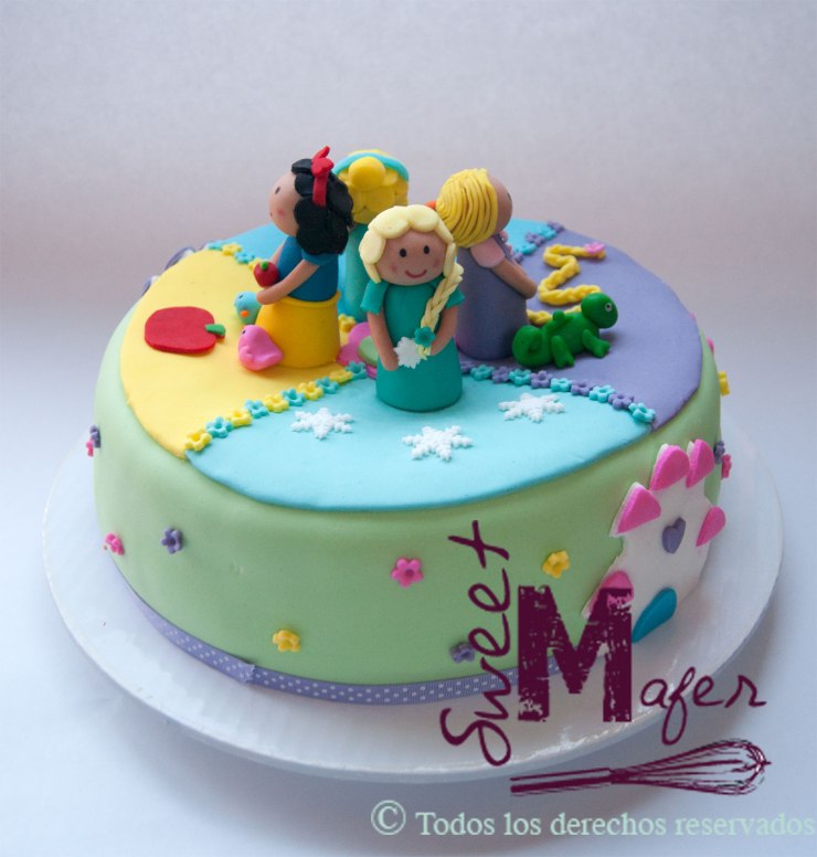Para la hija de Alex, hice esta tiernísima torta de princesas, con las princesas favoritas de Valeria. Las princesas siempre harán parte del imaginario infantil. Sé que algunos padres las detestan, mi sugerencia es: ¡No luchen contra las princesas! Sus hijas se cansarán de ellas en algún momento (bueno, eso es lo que suele pasar).