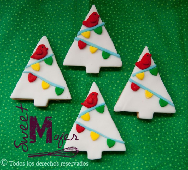 Galletas de arbolitos con banderines y pajarito.