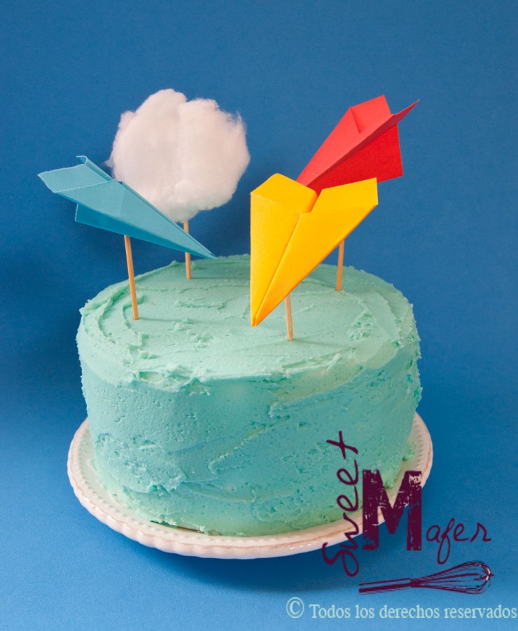 ¿A tu hijo le encantan los aviones de papel? Seguro que sí. Mi hija Antonia se divierte mucho haciéndolos y poniéndolos a volar por toda la casa (a veces con ayuda de su padre; y ni les cuento cómo queda este noble hogar). En esta ocasión le pedí a Anto que me ayudara a hacer varios, de colores, y con ellos decoré esta torta rústica. El resultado, ¡una torta muy tierna y divertida! Por cierto, si no saben cómo hacer aviones de papel, aquí hay un tutorial del equipo de Cómo se hace TV, en YouTube. Y, si quieren ver más tortas decoradas infantiles hechas por Sweet Mafer, los invito a que revisen este enlace.