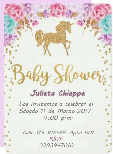 Mariana me encargó esta torta para el baby shower que le organizó a una amiga suya, usamos como inspiración la invitación que ella diseñó y la adaptamos a la torta. Hicimos un lindo marco con rosas lilas, moradas, turquesa y rosado, con la silueta de un unicornio dorado en la mitad, al lado el nombre y alrededor bolitas doradas. Era una torta para 15 personas, de media libra, en masa de almendra y naranja. A Mariana le encantó el resultado.