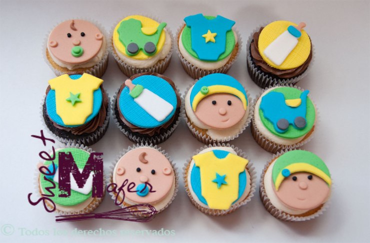 María Lucía me encargó estos cupcakes para el baby shower de una amiga suya. Hicimos caritas de bebé con y sin gorro, coches, teteros y bodies, todo en tonos azul, amarillo y verde. En total fueron 35 cupcakes en vainilla y chocolate. Quedaron muy contentos con el resultado.