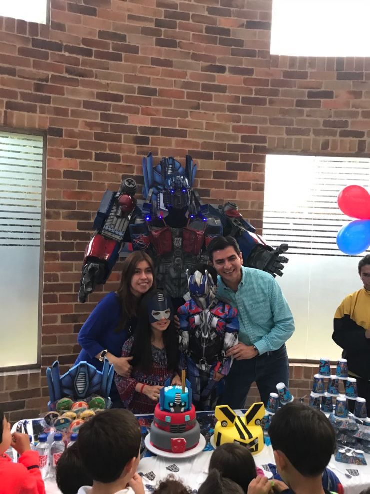Para el cumple de Juan Pablo, hicimos esta torta de robot de Transformers, una torta marmolada de 35 porciones. Su mamá, es amiga de una buena amiga y clienta nuestra, quien nos recomendó. La mamá de Juan Pablo se fue feliz y nos escribió para agradecernos porque todo estaba muy rico y muy lindo, además nos mandó la siguiente imagen de toda la familia con las tortas!