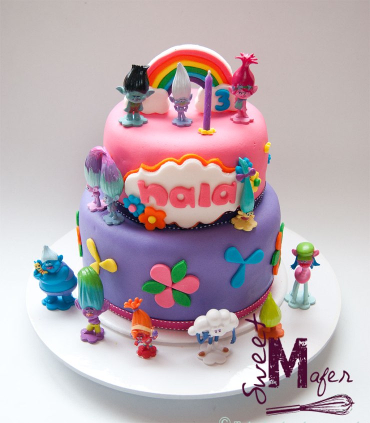 Hace dos años hice para una torta de Baby TV para el primer cumpleaños de Nala, este año, para su tercer cumpleaños, hice una torta y cupcakes a juego de Trolls, para las celebraciones en el jardín y en casa. Diana, su mamá, trajo una colección de Trolls de juguete con los que decoramos la torta. La celebración fue un éxito y Diana quedó muy contenta y agradecida.