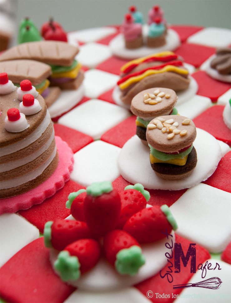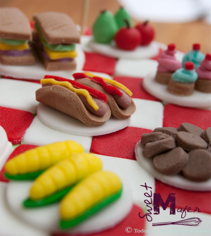 Mariana, me encargó esta linda torta de picnic para la celebración del cumple de su hija Helena, en un picnic. La torta era de 2 pisos, para 45 personas, en masa de chocolate, decorada con un picnic hecho completamente a mano, formado por torta, galletas, cupcakes, sandwiches, perros calientes, queso y uvas, manzanas y peras, hamburguesas y fresas. Mariana quedó muy contenta con el resultado y unos días después escribió para dar las gracias y decirnos que la torta había sido un éxito, que estaba no sólo muy linda, sino muy rica.