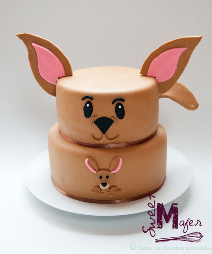 Hoy les presentamos una opción muy divertida y tierna para un baby shower, se trata de una torta de 16 porciones, de vainilla con mora, decorada como una cangura, con su bebé en la bolsa. Si quieres sorprender a alguna amiga que está embarazada o que acaba de tener bebé, seguro esta torta le encantará.