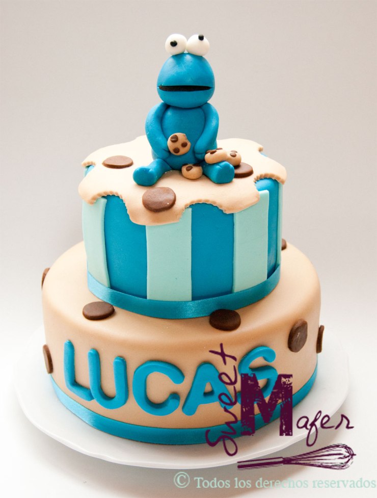 Cookie monster es un personaje muy divertido y que nunca pasa de moda, esta vez, hemos hecho una torta de dos pisos, uno decorado como una galleta con chips de chocolate y otro con rayas en tonos azules, encima tiene una galleta mordisqueada y un cookie monster sentado encima haciendo lo que más le gusta: comiendo galletas.
