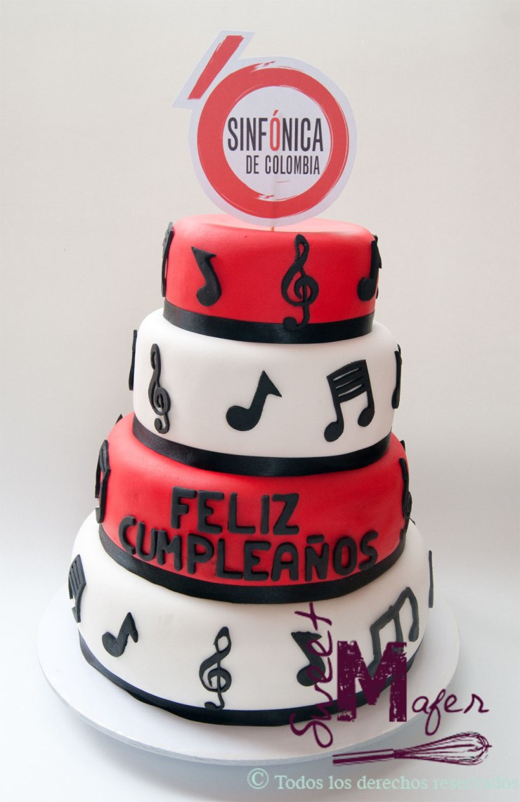 Ayer se celebró el aniversario de la Orquesta Sinfónica de Colombia y para ellos hicimos esta torta de 4 pisos, de almendra y naranja, decorada en rojo y blanco y con notas musicales negras, con el logo encima. La jefe de prensa de la orquesta es una vieja amiga mía del colegio y fue ella quien me recomendó para esta misión.