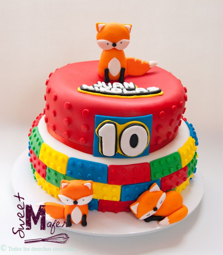 A Juan Nikolás le encanta armar Legos y le fascinan los zorritos, su mamá, Gina, no sabía si hacerle una torta de zorros o una de Lego para su fiesta de cumple, y finalmente le hicimos una torta de Lego con zorritos. Es una torta de chocolate para 50 personas, decorada con fichas de Lego en tonos fuertes y encima y a los lados tiene 3 tiernos zorritos.