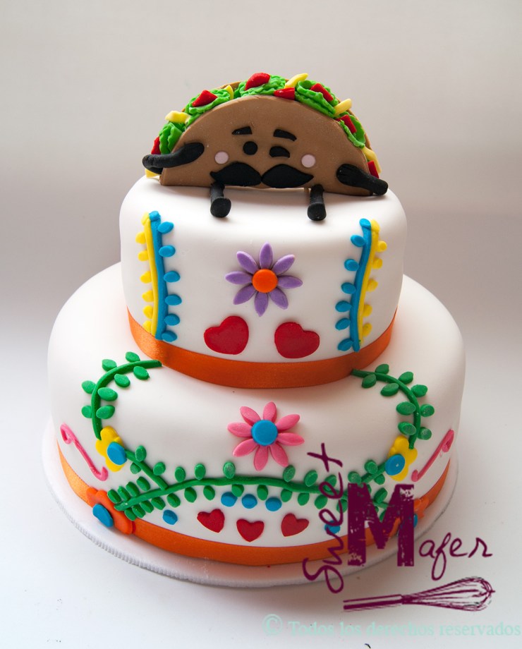 La hija de Susan cumplió dos y le organizaron una «taco party». Susan quería hacer una torta con inspiración mexicana, evocando los bordados mexicanos y quería incorporar los tacos y hacerlo más divertido. Hicimos esta torta de chocolate con capa de mora para 25 personas, decorada con flores, hojas y corazones, formando una especie de bordado en tonos vivos y encima pusimos un simpático taco kawaii, además, hicimos galletas de taco para los niños. Susan escribió para agradecernos proque la torta estaba muy linda y además muy rica, nos recomendó con sus amigos, por lo que también le agradecimos a ella.
