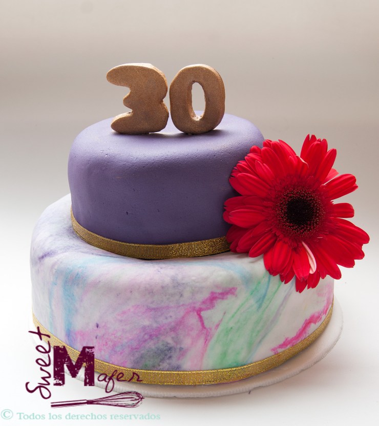 Hace poco cumplió 30 años mi prima Ángela María, para ella hice esta torta de vainilla con capa de arequipe, decorada en morado y con efecto marmolado de varios tonos, tenía un 30 dorado encima y una gérbera en rosado fuerte, que, sin saberlo, resultó ser su flor favorita. A Ángela le gustó mucho su torta!