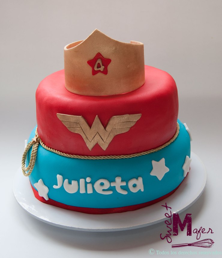 Julieta es hija de Diana, una amiga mía del colegio, nos conocemos hace más de 35 años. Hace unos días esta chiquitina cumplió 4 años y sus papás le organizaron una fiesta con temática de la Mujer Maravilla. Diana me encargó esta torta para 50 personas, decorada en azul con estrellas y en rojo con el emblema y la corona de la Mujer Maravilla. La torta fue todo un éxito!