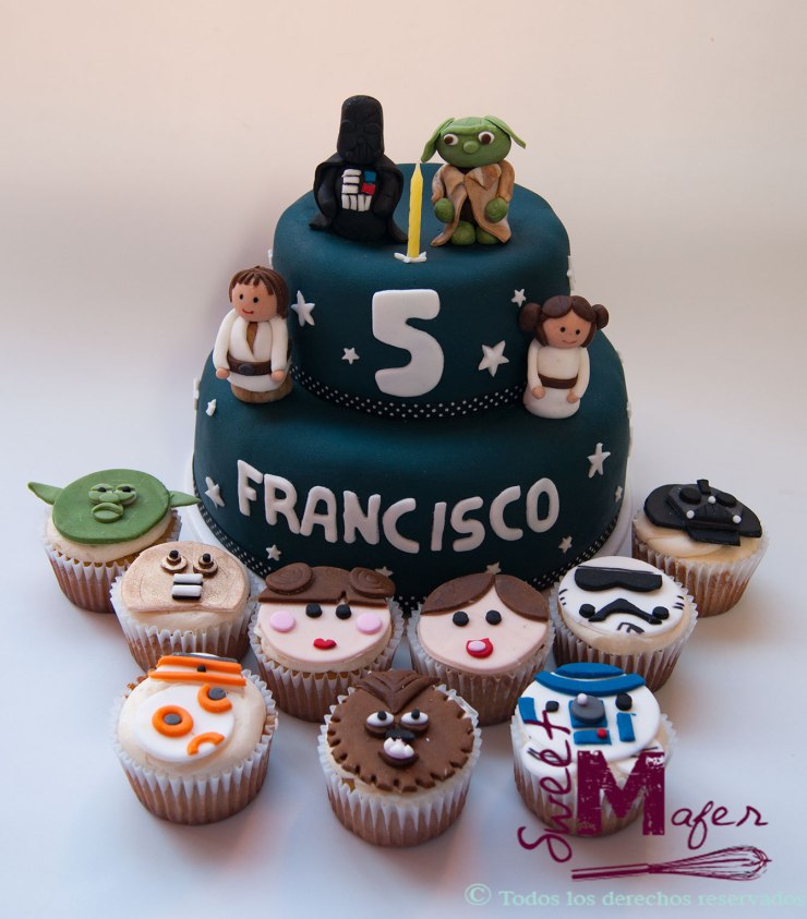 Hace unos días Francisco cumplió 5 años, su mamá, Alejandra, me encargó cupcakes de súper héroes para la celebración en el jardín, y una torta, cupcakes y galletas a juego de Star Wars para su fiesta de cumpleaños. Hicimos una torta marmolada para 25 personas, 25 cupcakes y 30 galletas a juego. Alejandra quedó muy contenta con el resultado.