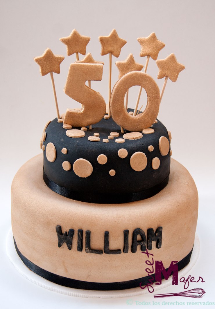 Vivian y Lina son clientes mías hace mucho tiempo, en esta ocasión me contactaron para pedirme una torta negra para 25 personas, para la celebración de los 50 años de William, esposo de la primera y cuñado de la segunda. Hicimos una torta decorada con negro y dorado, estrellas y el número 50.