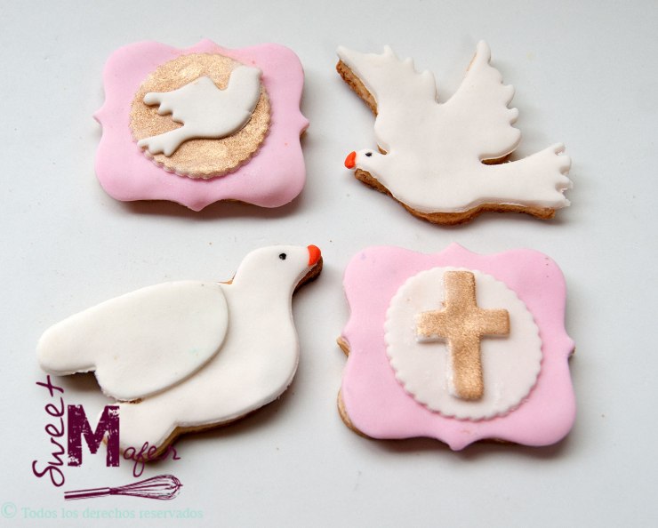 Hoy les presentamos una nueva propuesta de galletitas para primera comunión, ideales para dar como recordatorios o sorpresas y para decorar las mesas de la torta. Son galletas muy sencillas, decoradas en tonos suaves, en rosa, dorado y blanco para niñas y en azul, plateado y blanco para niños. En forma de marcos vintage con un redondel y en el centro las figuras de palomas y cruces, y también hay dos tipos de palomas.
