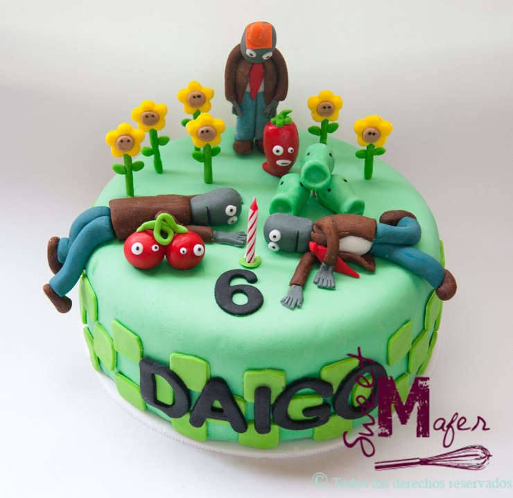 Daigo cumplió 6 y Leila, su mamá, me encargó esta torta de Plants vs Zombies para la celebración del cumpleaños en el colegio. Era una torta de vainilla con arequipe para 15 personas, decorada con flores, el ají, los tomates y 3 zombies. Leila nos ha encargado por tercer año consecutivo la torta para Daigo, hace dos años le hicimos dos de Plaza Sésamo y el año pasado una de R2D2. Daigo vino con sus papás a recoger la torta y les gustó mucho.
