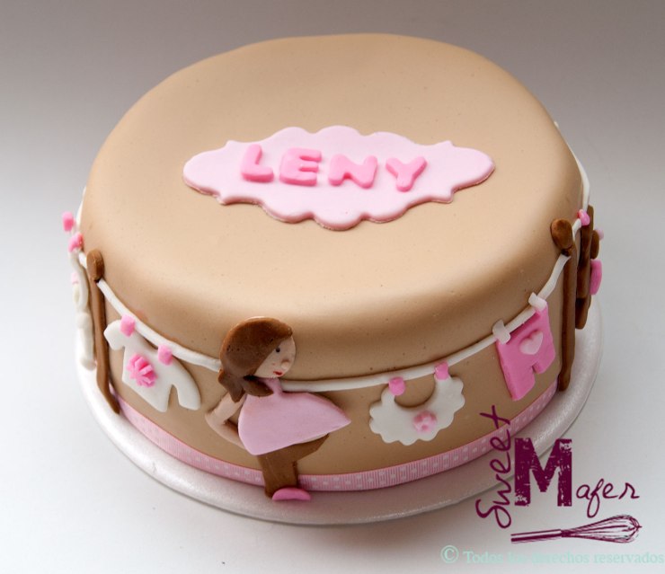 Leny y Nicolás son clientes míos hace tiempo, en esta ocasión él me llamó para que le hiciera una torta de cumpleaños para ella, como está embarazada él quería que la torta tuviera que ver con el tema del embarazo y por eso hicimos una mujer con pancita en medio de tenderos de ropa con cositas de bebé colgando. Nicolás escribió para dar las gracias y decirme que les había gustado mucho la torta.