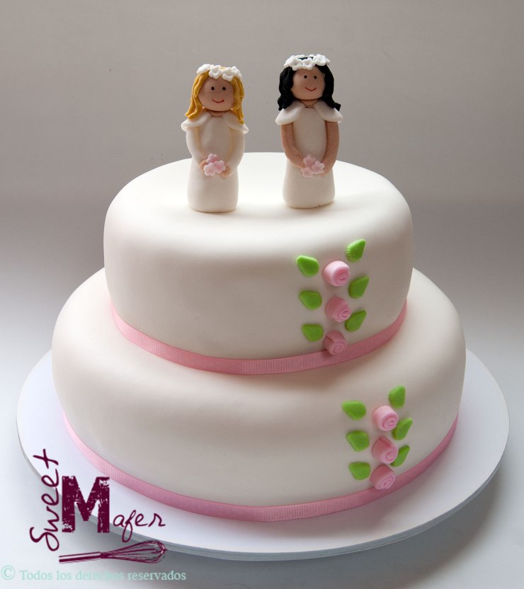 La hija y la sobrina de Adriana hicieron la primera comunión y ella me encargó esta linda torta para 40 personas en masa marmolada, decorada en blanco con florecitas y dos niñas, crespas, una rubia y otra pelinegra, una con vestido de manga corta y otra con mangas largas. Quedó muy contenta con el resultado de la torta!