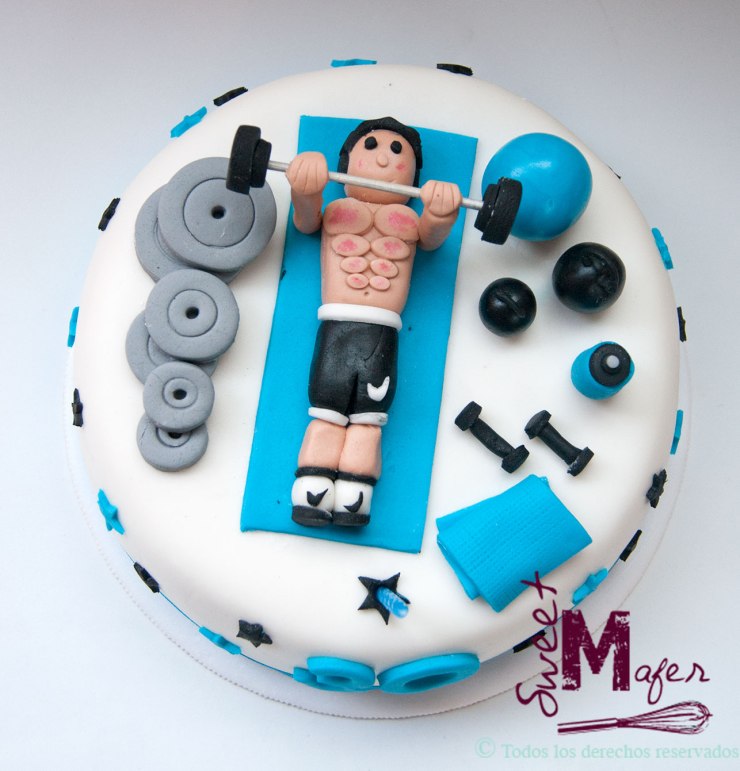 Jenny me encargó esta torta para el cumpleaños número 30 de su novio, me contó que a él le gustaba mucho ir al gimnasio y por eso hicimos esta torta para 24 personas, con cupcakes a juego con temática de gimnasio, un chico alzando una pesa, toalla, pesas, termo y otros implementos.