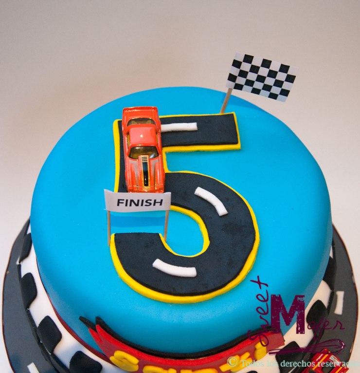 Santi cumplió 5 años y para su fiesta, su mamá me encargó esta torta para 50 personas, en masa marmolada, decorada con cuadros y un 5 formando una pista de carros. Ella me escribió después de la fiesta para decirme que la torta había quedado muy linda y muy rica, y para darme las gracias.