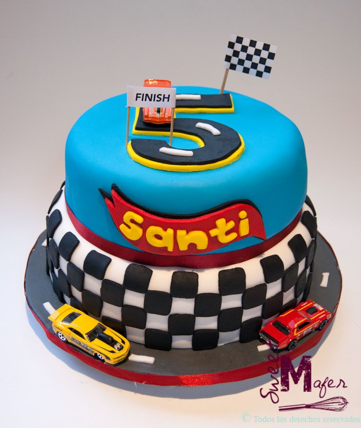 Santi cumplió 5 años y para su fiesta, su mamá me encargó esta torta para 50 personas, en masa marmolada, decorada con cuadros y un 5 formando una pista de carros. Ella me escribió después de la fiesta para decirme que la torta había quedado muy linda y muy rica, y para darme las gracias.