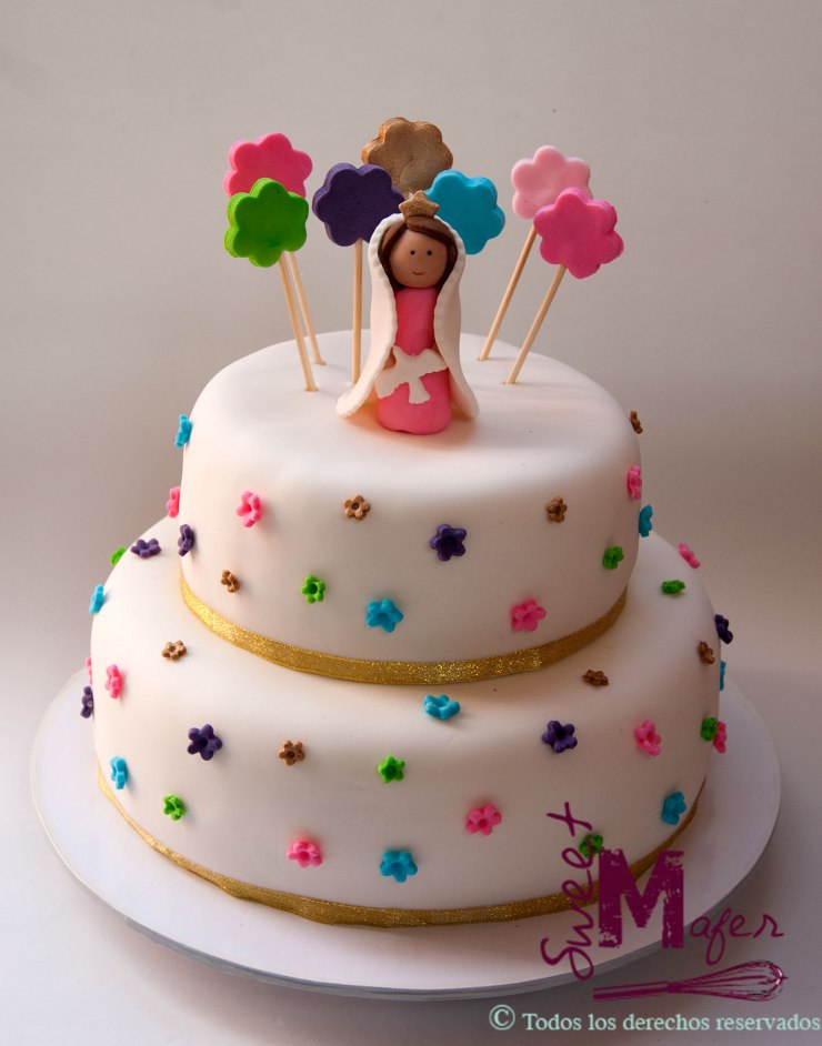 Cata es una de las mejores amigas de mi hija, hace unos días, ella y varias compañeras del cole hicieron la primera comunión. Su mamá, María Helena, quien además es muy buena amiga mía, me encargó esta linda torta con una virgencita encima y florecitas de colores para la fiesta de Cata, era una torta marmolada de 40 porciones y les gustó mucho.