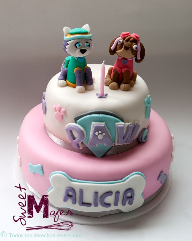 Alicia cumplió 6 y este año quería una torta de Paw Patrol, en años anteriores le hice tortas de cupcakes, Peppa Pig, etc. Alicia es hija de Janet, una compañera mía del colegio. En esta ocasión hicimos una torta marmolada para 25 personas, decorada en blanco y rosado, con huellitas de perro, huesitos y dos perritas de la patrulla canina. A Janet le encantó!