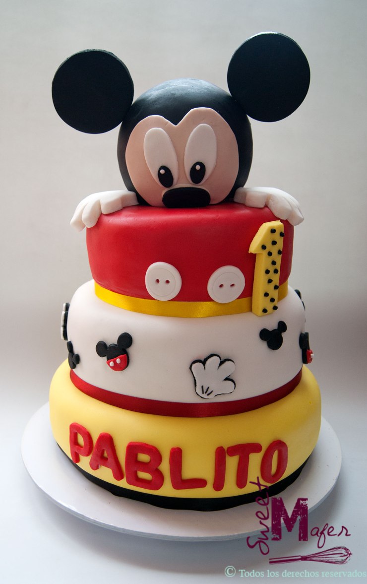 Pablo Nicolás cumplió un año, y su papá, Pablo, me encargó dos tortas, cada una de 60 porciones, una de almendra y naranja y otra de vainilla con mora, decoradas con temática de Mickey para su gran celebración. Jugamos con los tonos amarillo, blanco, rojo y negro, con las orejas, las manos, los botones, la silueta y la carita de Mickey.