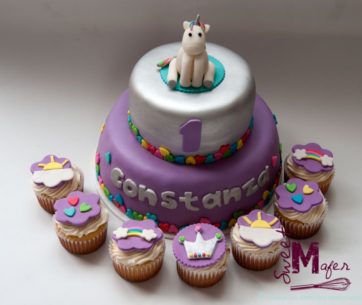 Constanza es la nieta de la embajadora de México en Colombia y su abuela le organizó dos celebraciones de cumpleaños. Para la primera le hicimos una torta para 20 personas decorada como unicornio, y para la segunda, una torta de vainilla con arequipe para 30 personas con 10 cupcakes a juego, decorada en lila y plata, con un unicornio, corazones y cupcakes con arcoiris, soles, coronas y corazoncitos. Quedaron muy contentas con el resultado.