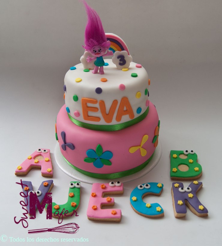 Eva cumplió 3, ella y sus padres acaban de llegar a vivir en el país y su mamá, Taciana, me encargó esta torta y galletas a juego para la celebración del cumple de Eva en el jardín. Hicimos una torta marmolada de 16 porciones y galletas con las iniciales de los nombres de los compañeritos de Eva, les gustó mucho y Eva me mandó mensajes de voz para darme las gracias.