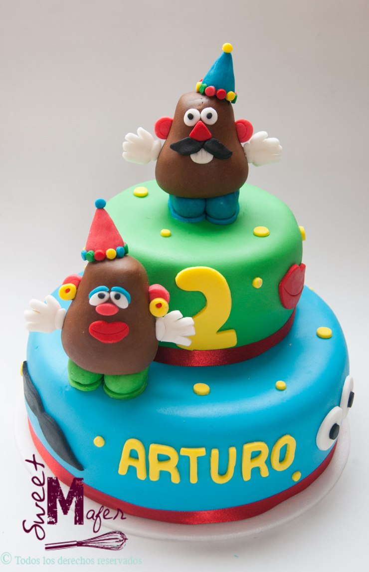 Arturo cumplió dos años y sus papás, Alexandra y Manuel me llamaron nuevamente para hacerle su torta de cumpleaños. El año pasado le hicimos una torta del espacio y en esta ocasión una torta del Señor y la Señora cara de papa. Hicimos una torta de 25 porciones, de vainilla con capita de arequipe, decorada en verde y azul, con ojos, bocas, bigotes y otras piezas de las que se encajan en la cabeza del señor patata. Les encantó!