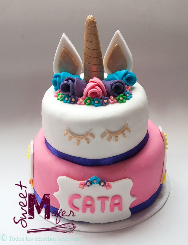 Cata es una de las mejores amigas de mi hija Antonia y hace unos días cumplió años. Quería una torta de unicornio, pero como además, adora patinar, María Helena, su mamá, me pidió ponerle patines en la base de la torta. Hicimos una torta marmolada para 16, con base rosada con patines y encima el unicornio con flores rosadas, azules y moradas. Les gustó mucho!