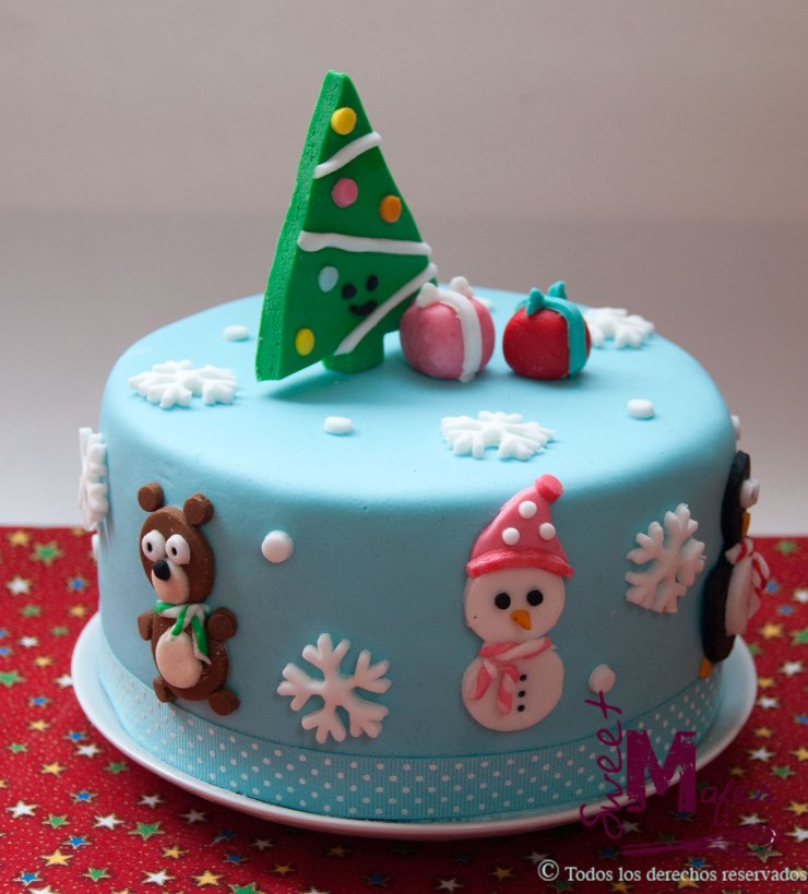 Esta torta es ideal para celebraciones de navidad con niños, es una torta con fondo azul claro, estrellas polares y decorada con varios personajes navideños al estilo kawaii, pingüino, oso, reno, muñeco de nieve y arbolito. Disponible en cake negro de navidad, vainilla, marmolada, chocolate, vainilla con mora o arequipe, y almendra y naranja, en presentaciones para 6 o 10 porciones.