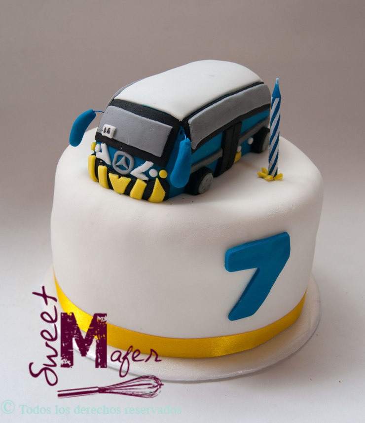 Santiago cumplió 7, los dos años pasados le hemos hecho las tortas de sus fiestas, de Lego y del mundial de Rusia. Este año, hicimos esta tortica con una réplica del bus de su colegio para el día exacto de su cumple y otras tortas para su fiesta. Esta era una torta de chocolate para 6 personas y además hicimos una torta de zanahoria para la celebración con la familia.