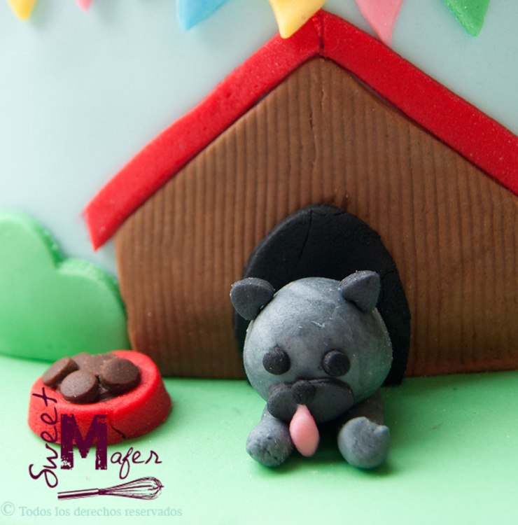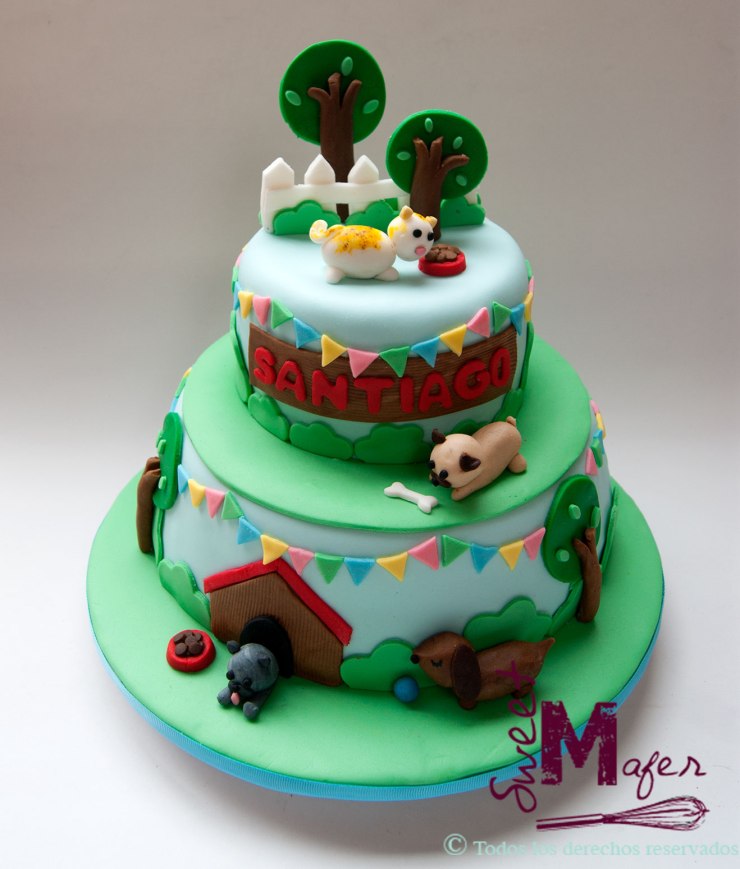 Yaneth organizó un gran baby shower para la llegada de Santiago, su sobrinito. A ella le encantan los perros así que hicimos esta linda torta con perros y gatos celebrando. Arriba tiene un gato, árboles y una reja, en medio un perro jugando y abajo dos perritos más, está rodeada con banderines y tiene árboles alrededor.¡Le encantó!