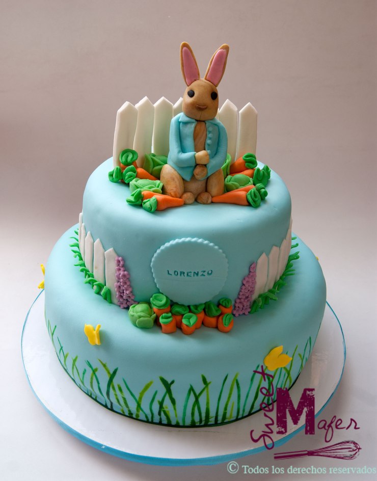 Paola me encargó esta linda torta y galletitas a juego para el bautizo de su bebé, Lorenzo. Hace unos años hice la torta de boda de Paola y Juan Carlos, nos conocemos hace mucho tiempo y fue un placer haber podido estar presente en otro momento dulce de su vida. Ella quería una torta con el conejo en su huerta, la reja y pastitos y se emocionó mucho cuando la vió terminada, además hicimos unas galletitas de conejos para darle como recordatorio a los invitados.