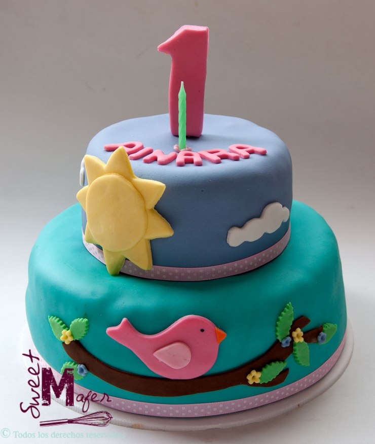 Ainara cumplió un año, su nombre significa golondrina, y su mamá, Viviana, quería una torta con un pajarito. Hicimos esta torta de vainilla con arequipe para 25 personas, decorada en verde menta y lila, con una pajarita posada en una rama con hojitas y flores, un sol, nubes y el número 1. A Viviana le gustó mucho.