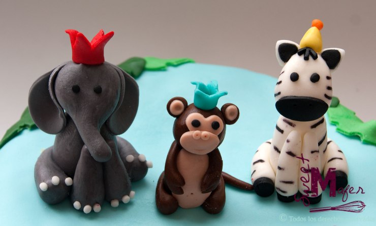 Diana me encargó esta torta de animales de la selva, para tres pequeñines que cumplían 3 años y que iban a celebrarlo en su jardín con sus compañeros. Hicimos una torta de almendra y naranja de 15 porciones con dos monitos, una cebra y un elefante celebrando el cumple. Le gustó mucho.