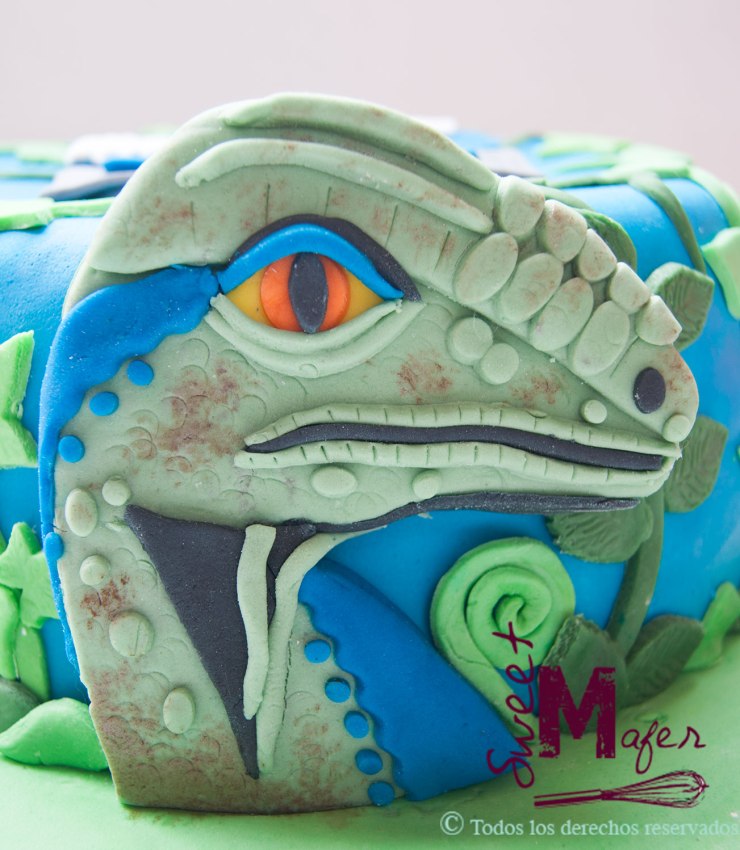 Daigo cumplió años y su mamá, Leila, me encargó nuevamente su torta de cumple. Cuando cumplió 4 le hicimos dos tortas de Plaza Sésamo, a los 5 una torta en forma de R2D2, a los 6 una de Plants vs Zoombies, y en esta ocasión, para celebrar sus 7 años, una de Jurassic World. Se trata de una torta para 25 personas, de vainilla con capita de arequipe, decorada en azul, con el logo de la película en la parte superior, muchas ramas y hojas, y al frente un imponente dinosaurio. Daigo quedó muy feliz con su torta.