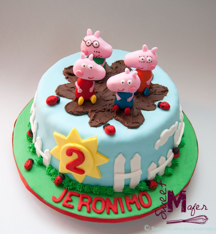 Jerónimo cumplió dos años y le fascina George Pig. Su papá, Diego, me encargó esta torta con cupcakes a juego para la celebración del cumple de su chiquito. Hicimos una torta marmolada de 25 porciones, decorada con Peppa y su familia sentados sobre una charco y 10 cupcakes, de almendra y naranja, y chocolate con las caras de los personajes de Peppa. ¡Les gustó mucho!