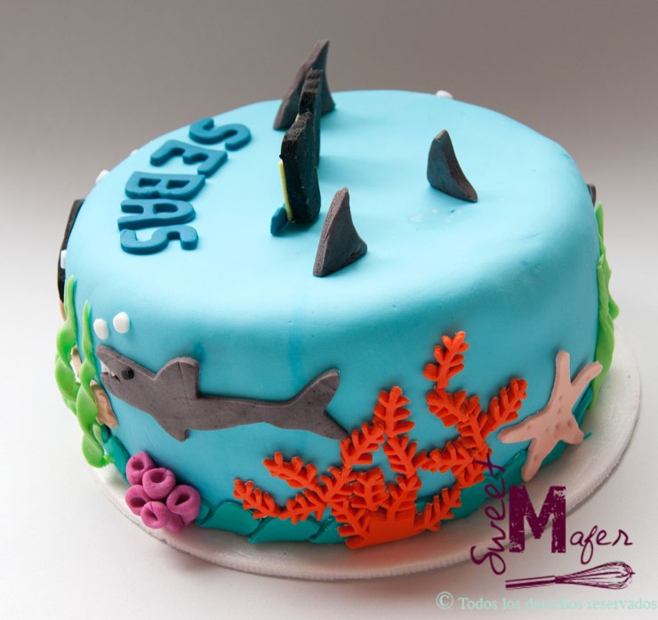 Alejandra me encargó esta torta para su hermano Sebastián, que es biólogo y a quien le encanta bucear y es apeneista. Hicimos esta linda torta con un buzo, tiburones, cangrejo, estrella de mar y corales. Era una torta de almendra y naranja para 10 personas y Alejandra se fue muy feliz!