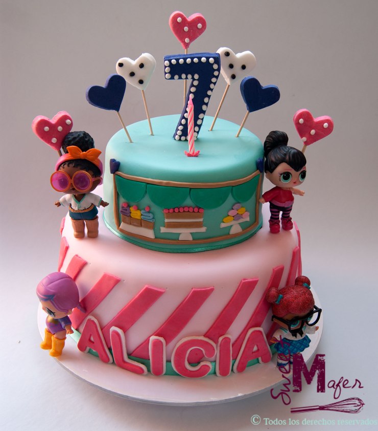 Alicia es hija de Janet, una compañera mía de colegio y desde chiquita le he hecho varias tortas de cumpleaños. Este año quería una de muñecas LOL, así que le hicimos una torta de chocolate para 25 personas, decorada en verde menta y rosado pastel, con una vitrina de dulces, rayas y muchos corazones. ¡Le gustó mucho!