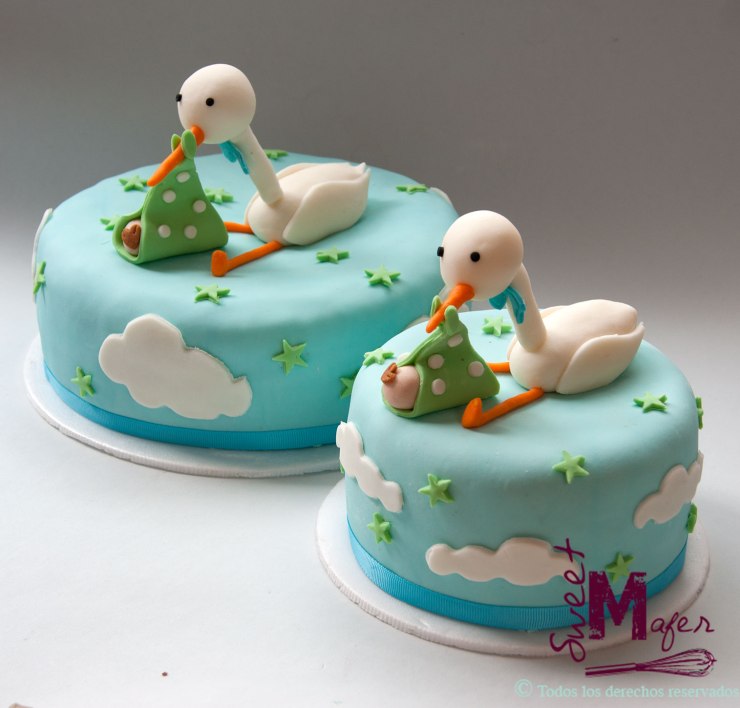 Diana y su esposo, organizaron un par de reuniones con las familias de ambos, para darles una gran notica: ¡están embarazados! Para la familia de ella, hicimos una torta de 6 porciones de almendra y naranja, y para la familia de su esposo, una torta marmolada de 15 porciones, las dos las decoramos sobre un fondo azul con nubes, y tenían una tierna cigüeña, sosteniendo un bebé. Diana me escribió para dar las gracias y para contarme que fue una linda manera de compartir la noticia.
