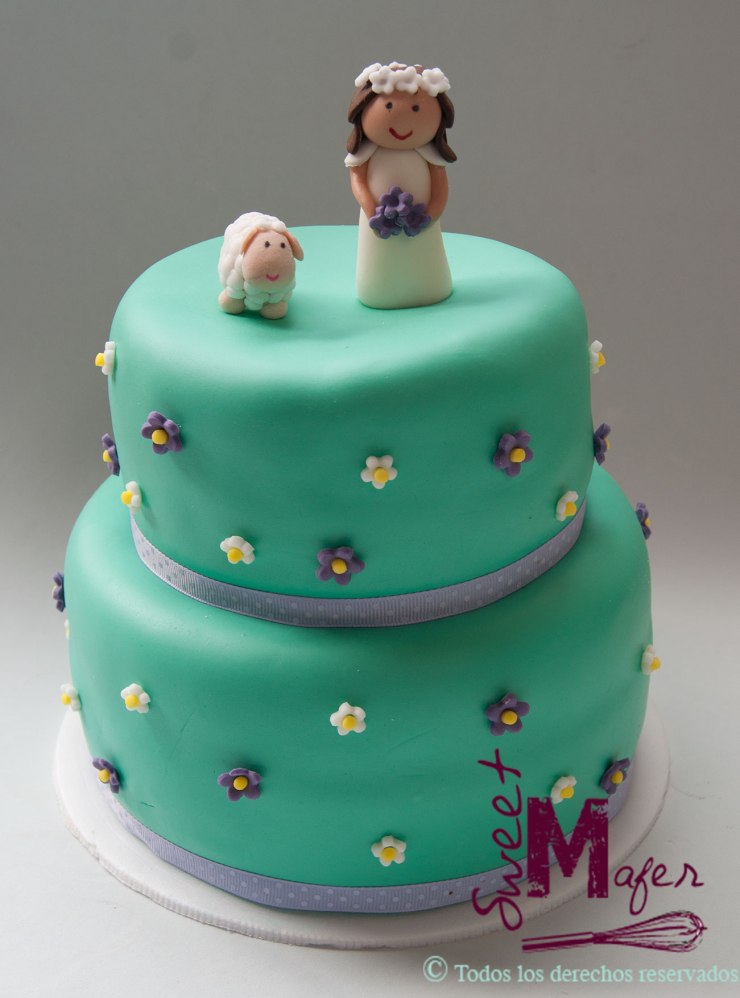 Luciana es hermana de Tomás, un compañero de colegio de mi hija. Su papá, Fernando, me encargó una torta para la primera comunión de Luciana. Hicimos una torta marmolada de 16 porciones, decorada en aguamarina, el color favorito de la niña, con flores, una niña y una ovejita. ¡Les encantó!