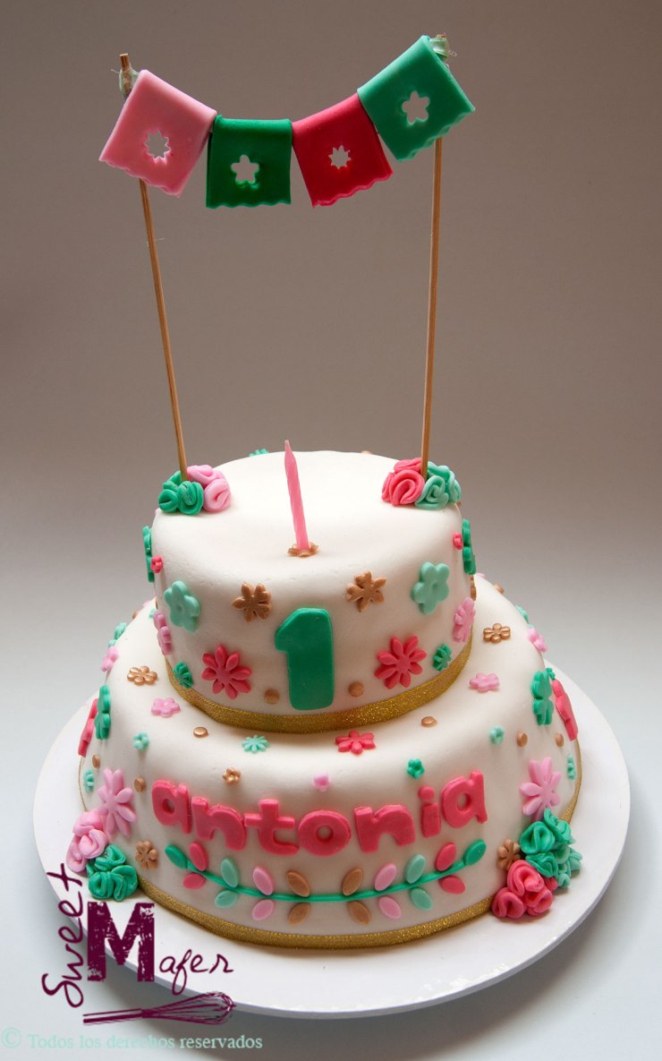 Antonia cumplió 1 año y su mamá, Sandra, me encargó esta torta con inspiración mexicana para la celebración en familia, era una torta de 30 porciones, de vainilla con capa de arequipe, decorada en tonos rosados, menta y dorado. ¡Le encantó el resultado!