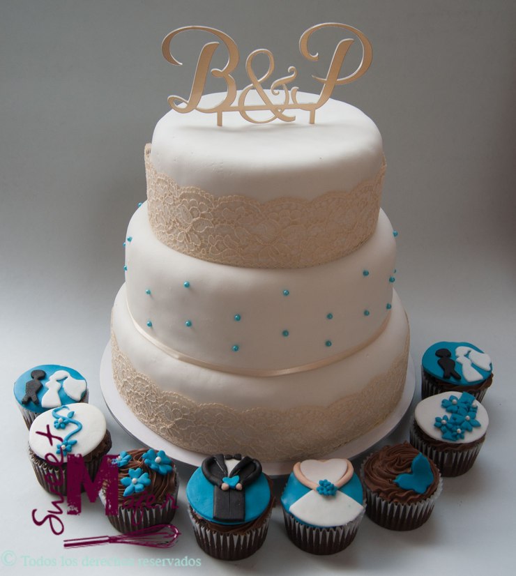 Bibiana es hermana de María Claudia, una antigua y muy fiel clienta de Sweet Mafer. Bibiana y Pablo se casaron hace poco, y María Caludia me encargó la torta, cupcakes y galletas a juego para la fiesta. Hicimos una torta negra de 60 porciones decorada con encaje color champaña y perlas azules, con topper de Solo Gloria. Además 20 cupcakes con motivos de matrimonio y 40 galletas para entregar como recordatorios. ¡Les gustó mucho!